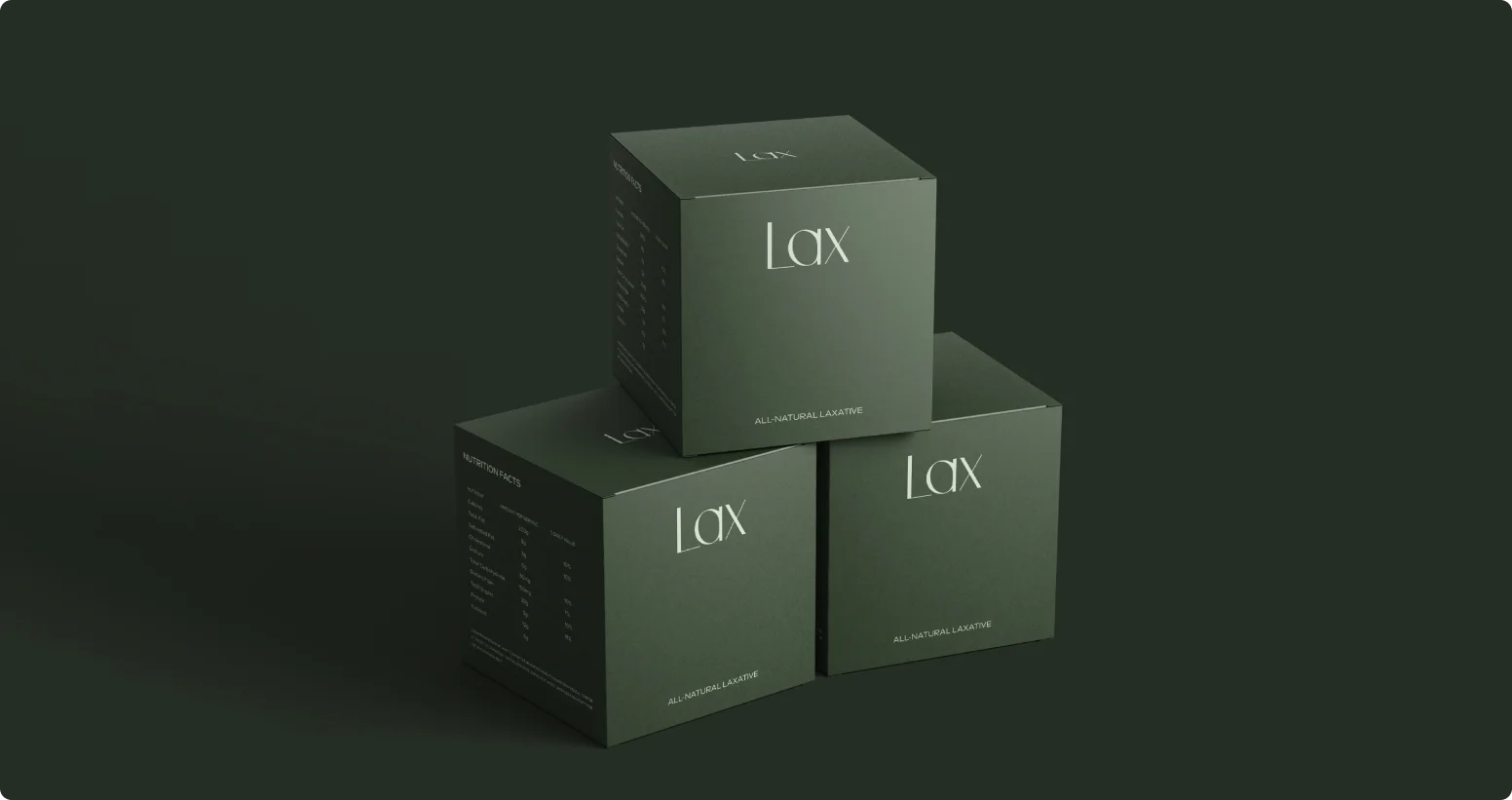 At the center of the packaging is the minimal “Lax” typography, set in an elegant serif style. The simplicity of the brand name allows it to stand out clearly while conveying a sense of confidence and authority. Supporting text such as “All-Natural Laxative” provides immediate clarity about the product’s purpose while maintaining the clean visual hierarchy.